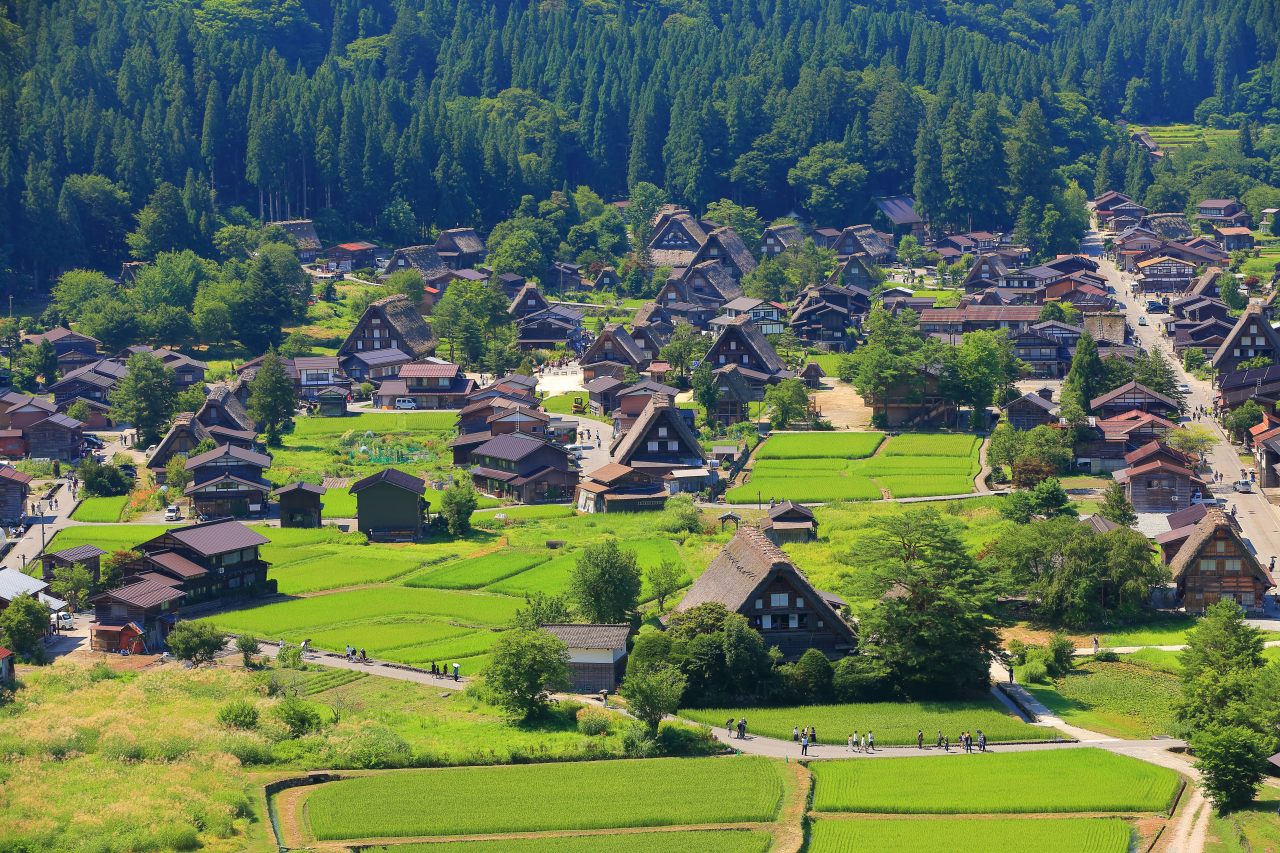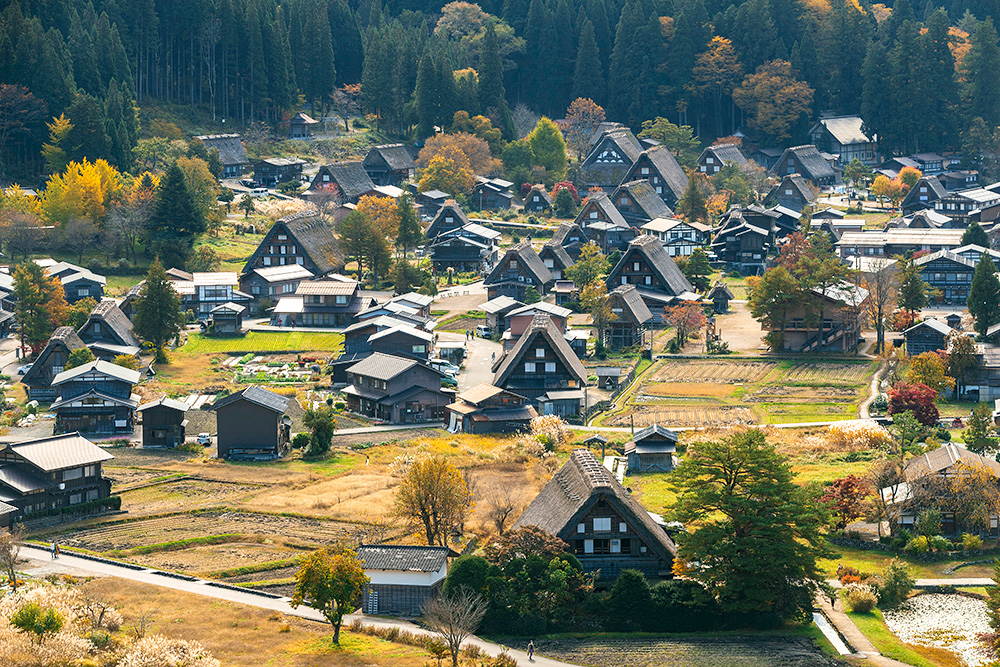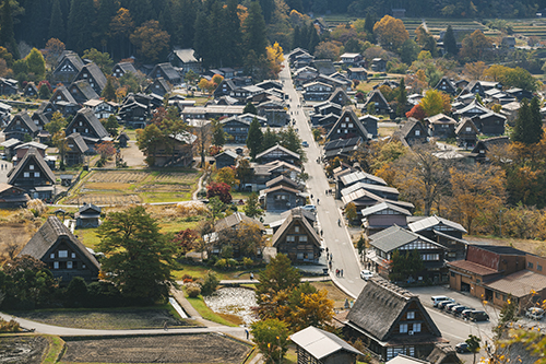 春は新緑、夏は青々とした緑、秋は黄金色の稲穂、冬は真っ白な雪景色。四季折々の風景は何度訪れても感動を与えてくれます。世界遺産白川郷合掌集落が一望できる「天守閣展望台」は白川村でも大人気スポットです。